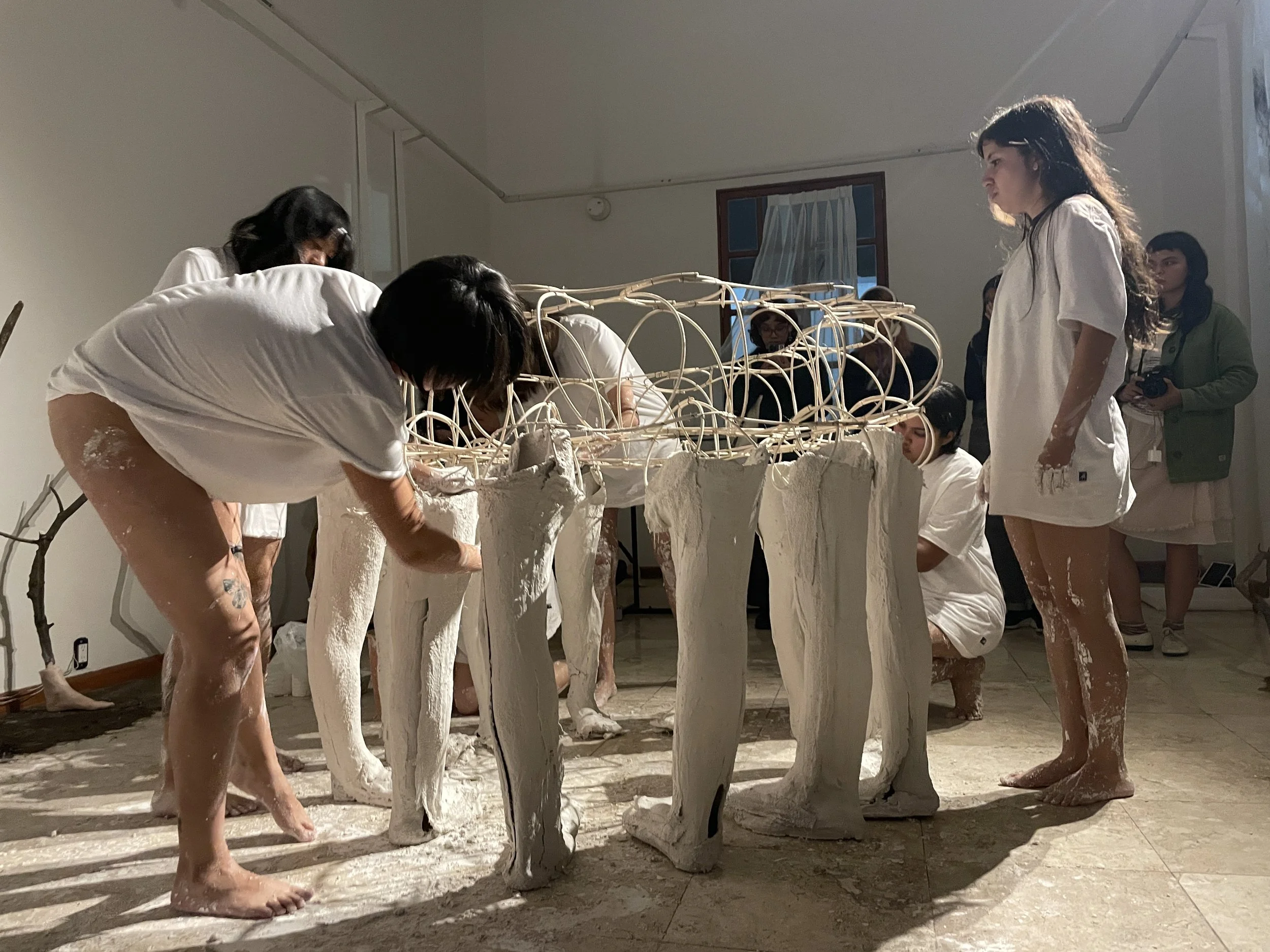 En este performance, seis mujeres nos hacemos moldes de nuestras piernas unas a otras en distintas habitaciones de la galería. Mientras tanto, hacemos un canto que se comunican de un cuarto a otro. Al final hacemos un círculo de piernas unidos en una estructura geométrica de mimbre.