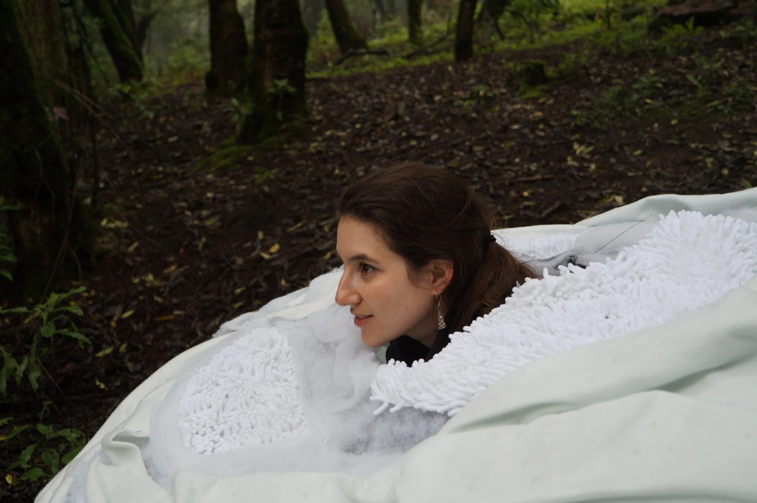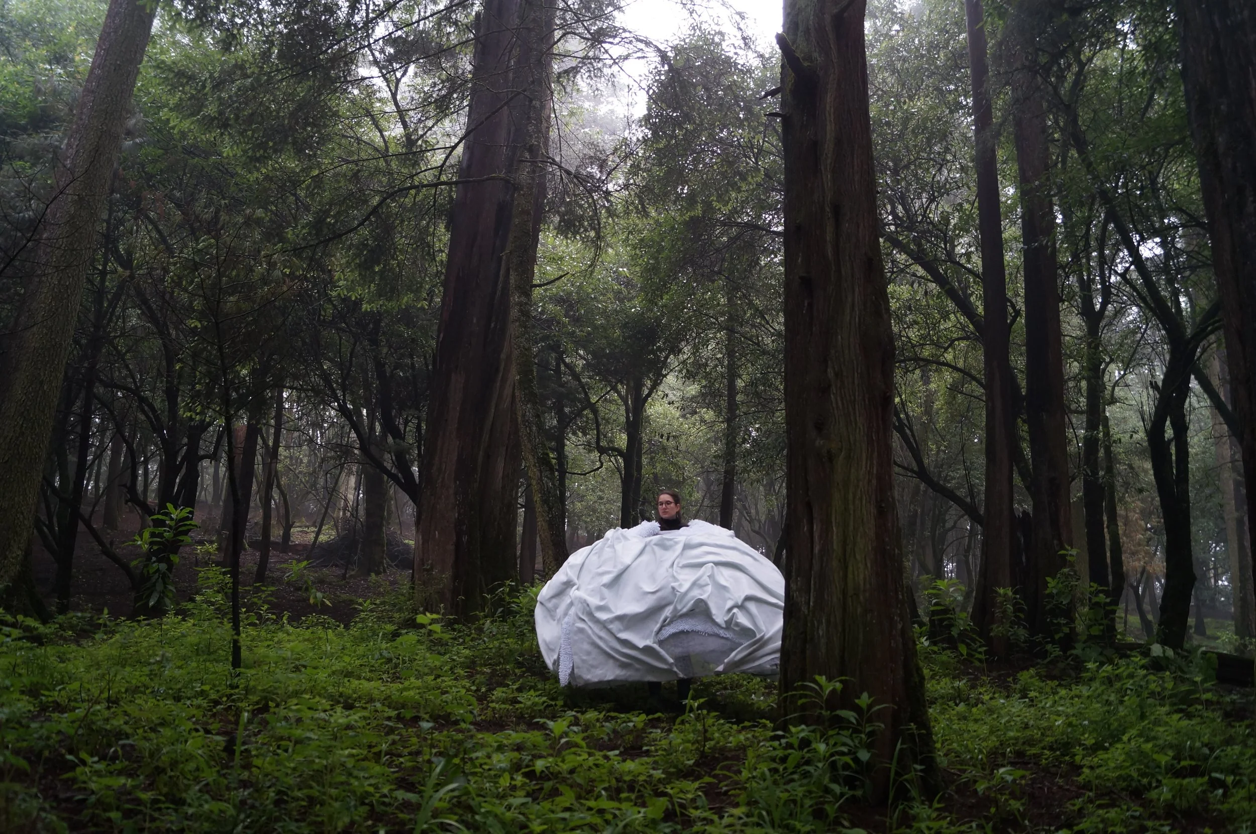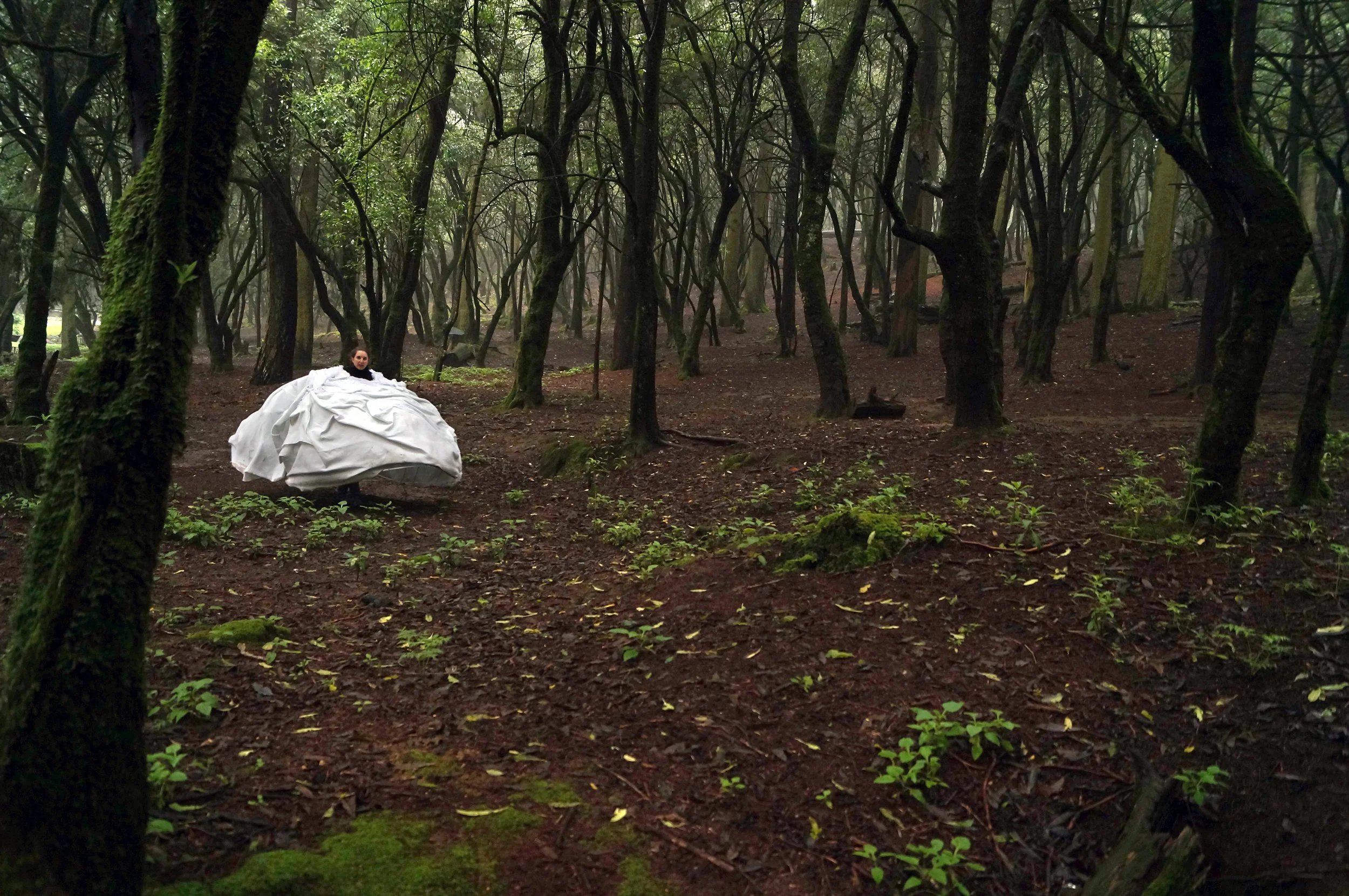 Caminata en el bosque utilizando una estructura habitable hecha de fieltro industrial. La pieza parte de la construcción de un espacio personal portable, con una artificios apariencia orgánica que separa y protege pero que impide la interacción directa con el entorno.
