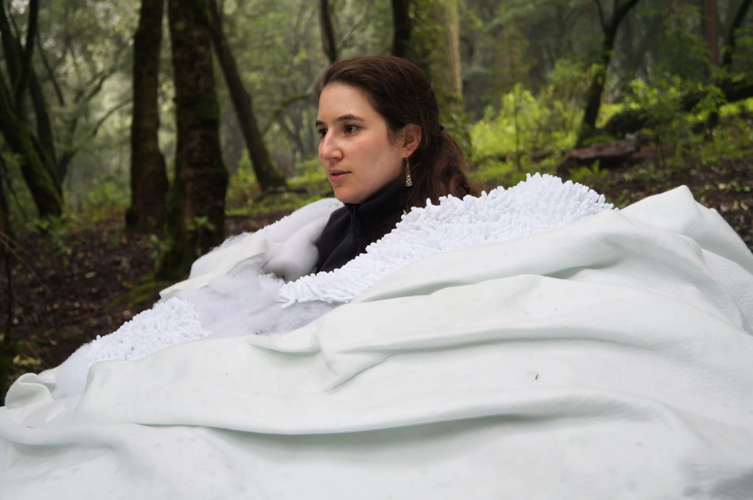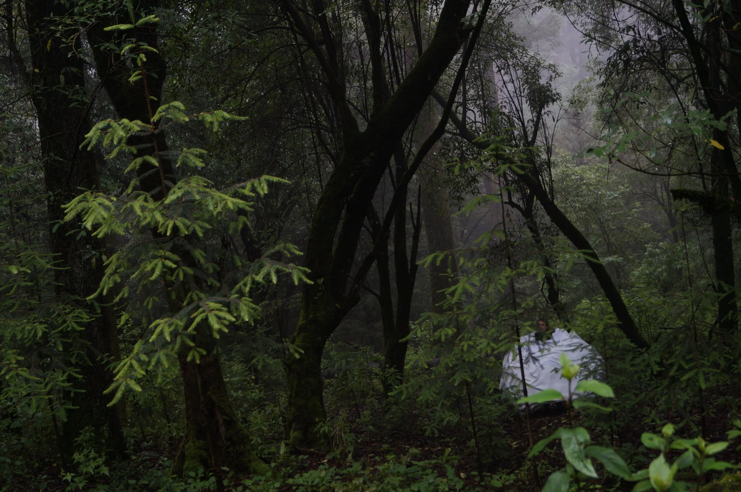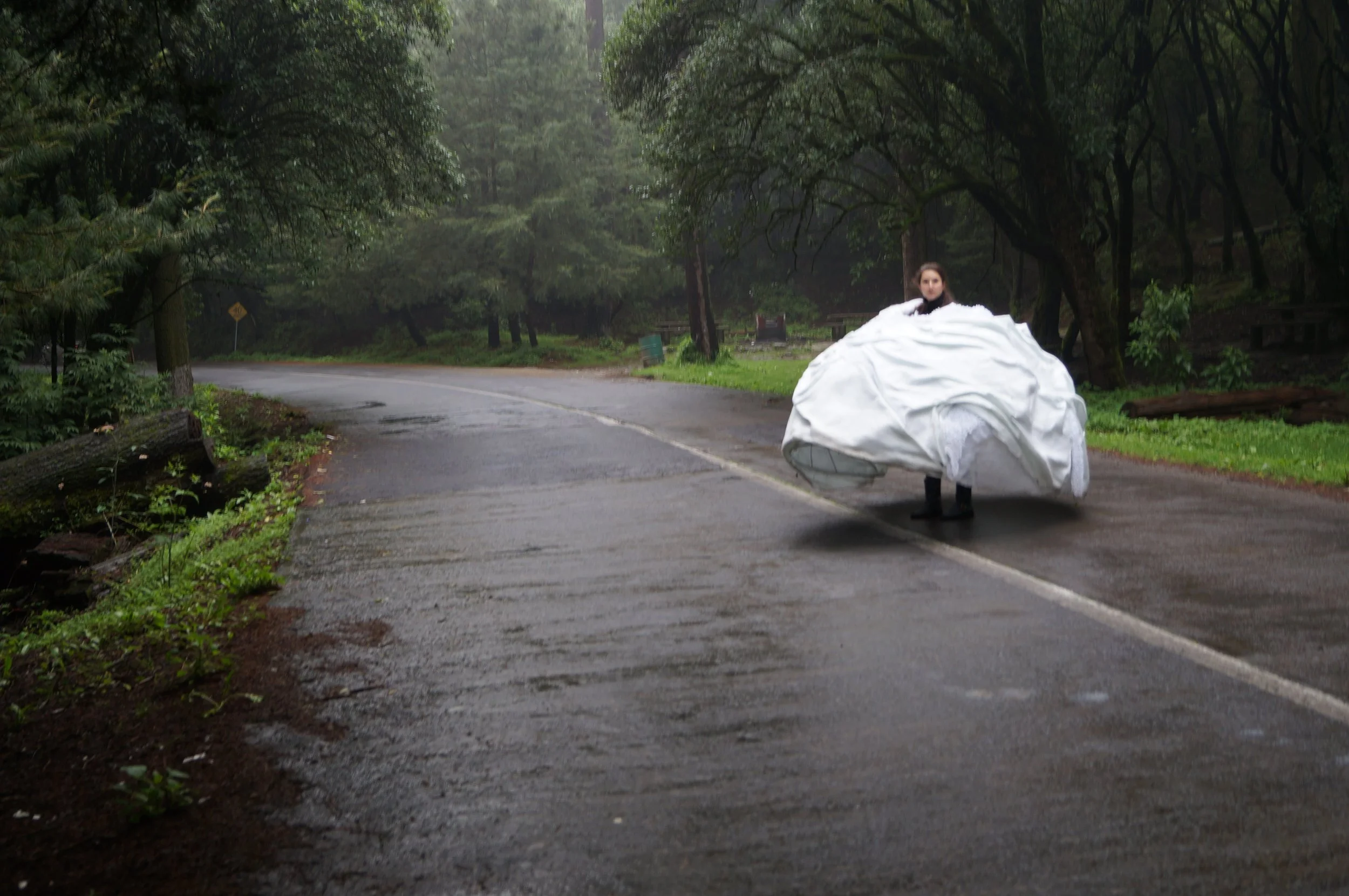 Caminata en el bosque utilizando una estructura habitable hecha de fieltro industrial. La pieza parte de la construcción de un espacio personal portable, con una artificios apariencia orgánica que separa y protege pero que impide la interacción directa con el entorno.